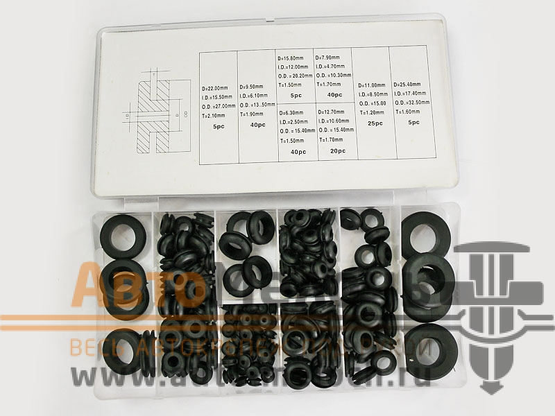 Универсальный набор резиновых уплотнительных втулок содержит 8 типоразмеров, применяемых в автомобиле. Служит для прокладки электропроводки, уплотнения магистралей и топливопроводов в местах соприкосновения с металлическими деталями кузова. При производстве используется высококачественная резина, стойкая к перепадам температур и механическому износу. Набор поставляется в пластмассовом боксе, разделенном на сектора и содержит 180 уплотнительных элементов.